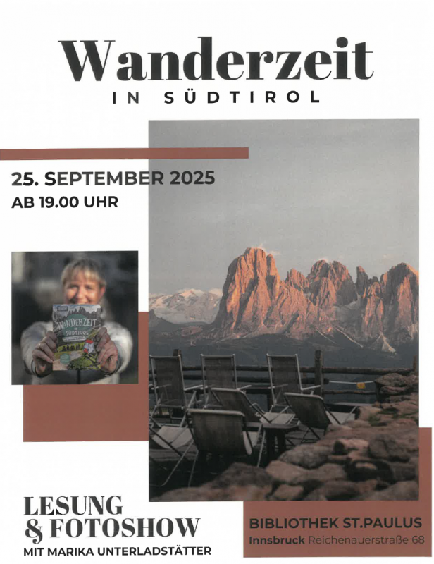 Veranstaltung WANDERZEIT IN SÜDTIROLDatum: 25.09. - 19:00 Uhr bis 25.09. - 21:30 Uhr